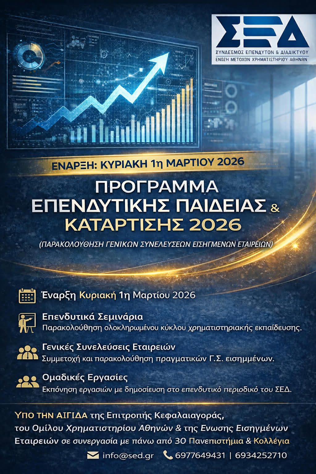 Ο Σύνδεσμος Επενδυτών & Διαδικτύου διοργανώνει για 12η συνεχόμενη χρονιά, το «Πρόγραμμα Επενδυτικής Παιδείας & Κατάρτισης 2026», υπό την αιγίδα της Επιτροπής Κεφαλαιαγοράς, του Ομίλου Χρηματιστηρίου Αθηνών & της Ένωσης Εισηγμένων Εταιρειών.
