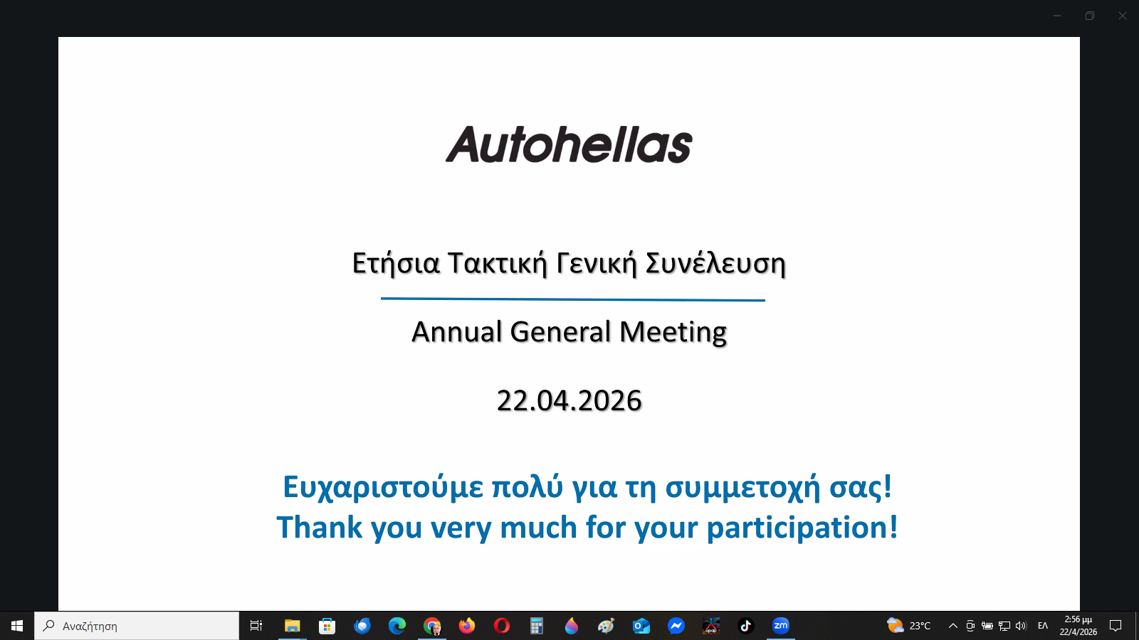 Η Γεν. Συνέλευση έγινε στην έδρα της εταιρείας την Τετάρτη 22 Απριλίου 2026, και μεταδόθηκε μέσω διαδικτύου. Κεντρικός ομιλητής ήταν ο Πρόεδρος της εταιρείαςκ.Ευτύχιος Βασιλάκης, ο οποίος απάντησε σε όλες τις ερωτήσεις που υπέβαλλαν οι μέτοχοι.